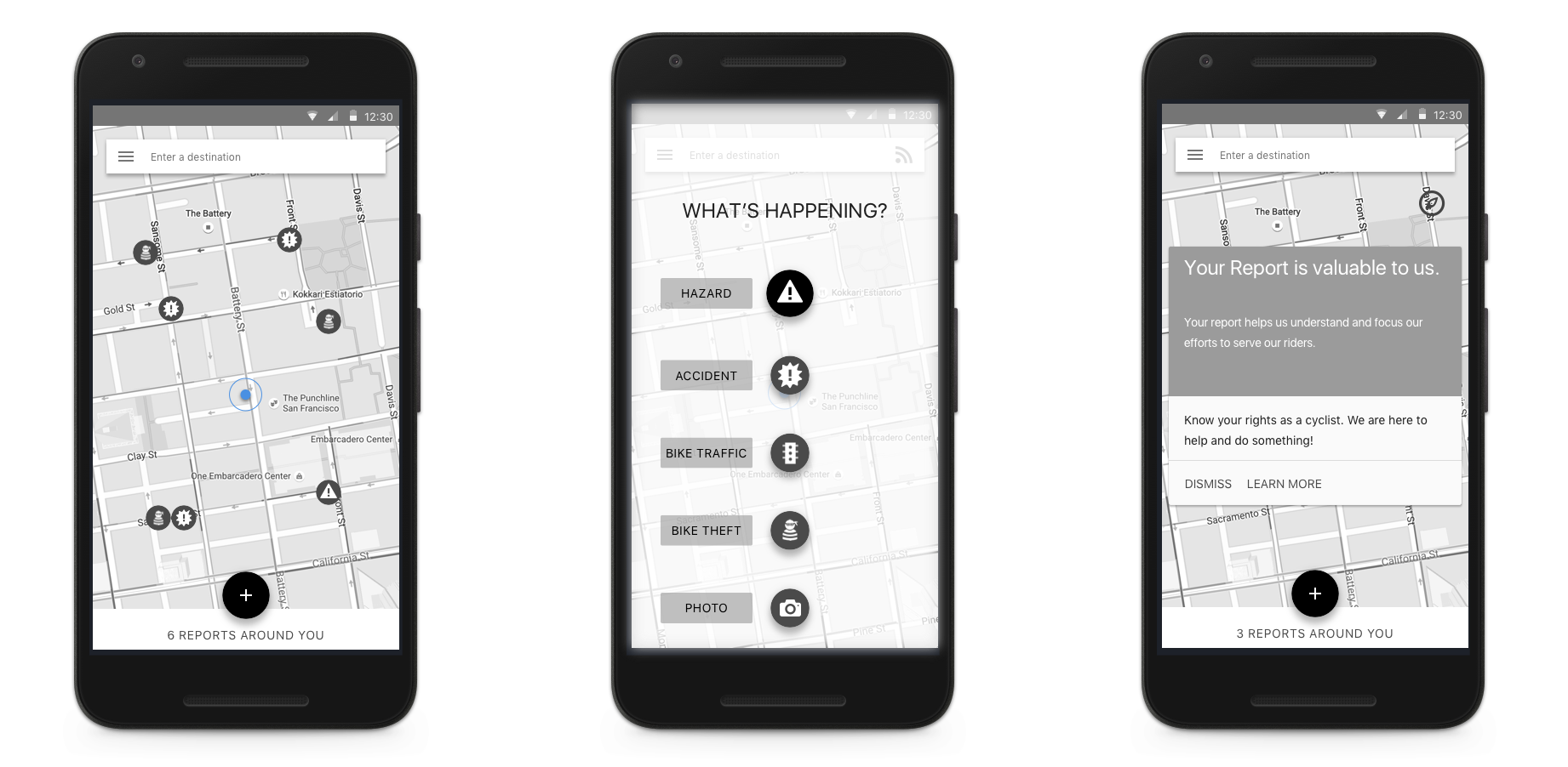 We designed a mobile app for San Francisco cyclists that made it easy to share and consume information related to their biking experience. Cyclists using the app can quickly see what others have shared around their location. Adding information to the app is as easy as tapping on the plus button.
