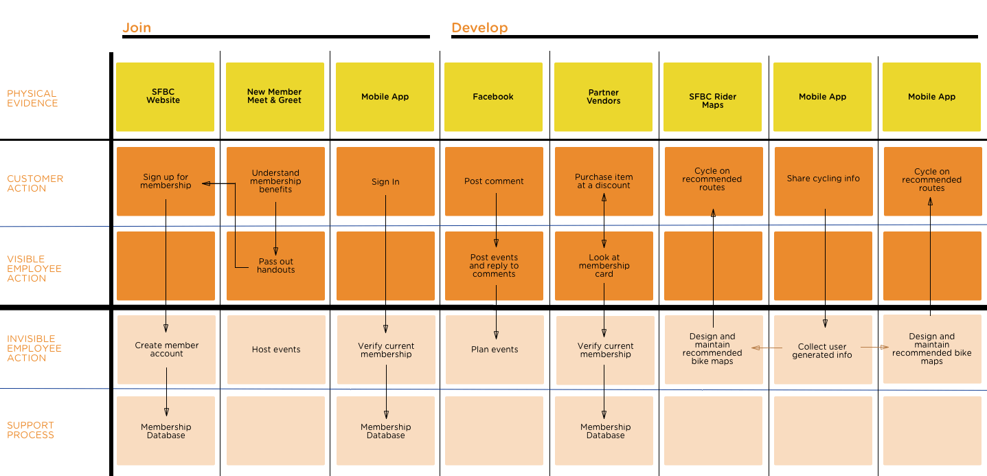 In thinking about future steps for the app, it is vital to understand that the SFBC is inherently an entity that provides services to its members. For continuous engagement, the app would have to integrate well within the SFBC’s existing framework of services but also expand on them. By creating a service blueprint and understanding the various touchpoints members have with the SFBC, we propose the following design addtions to the app: