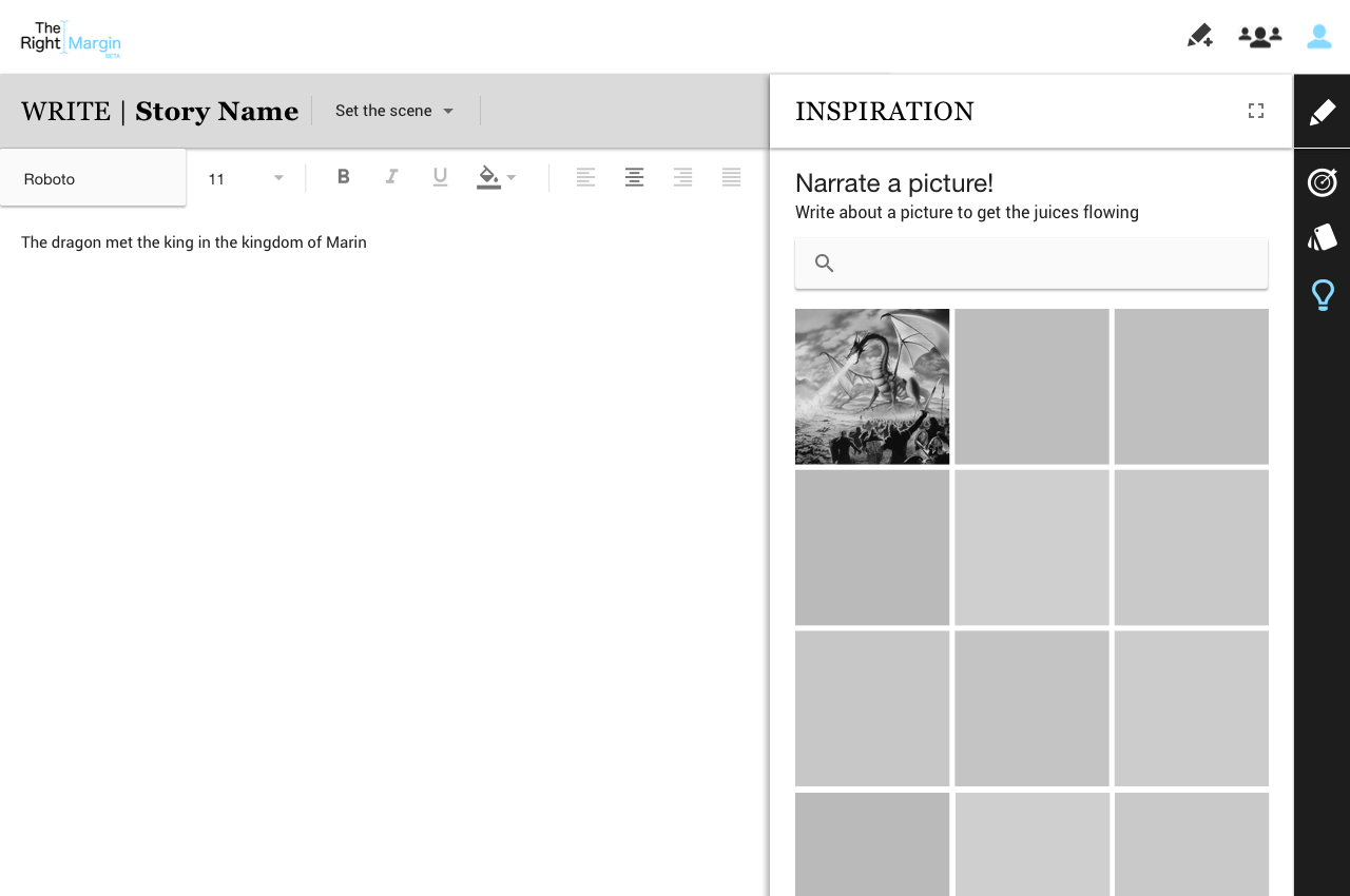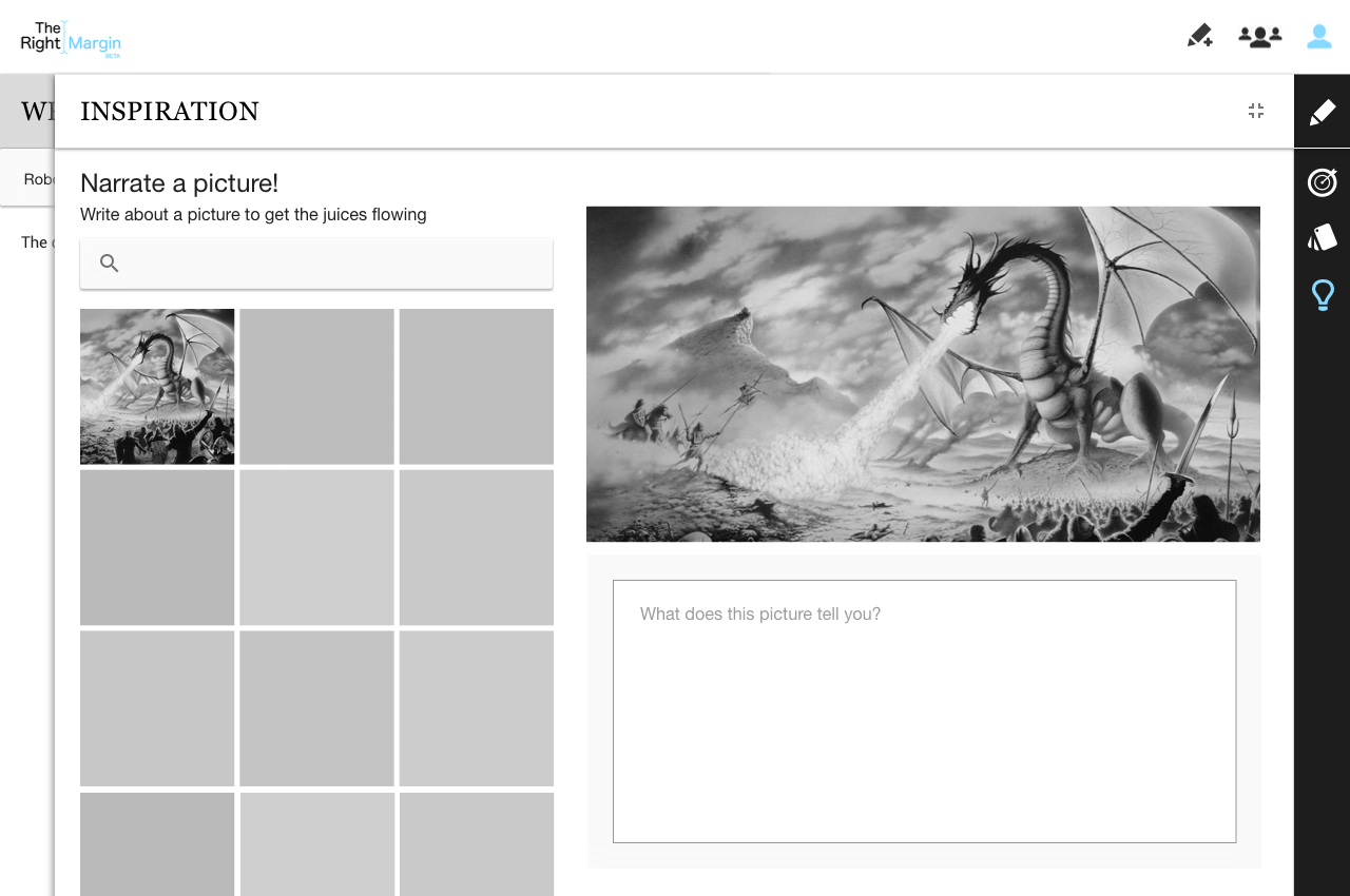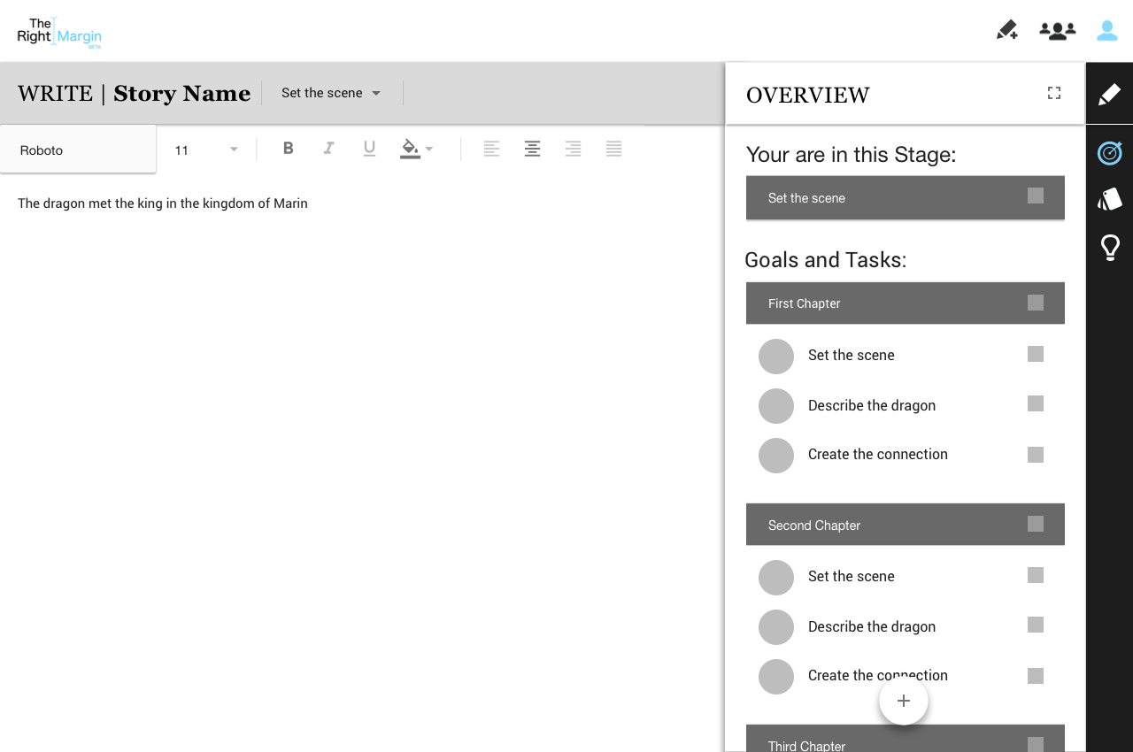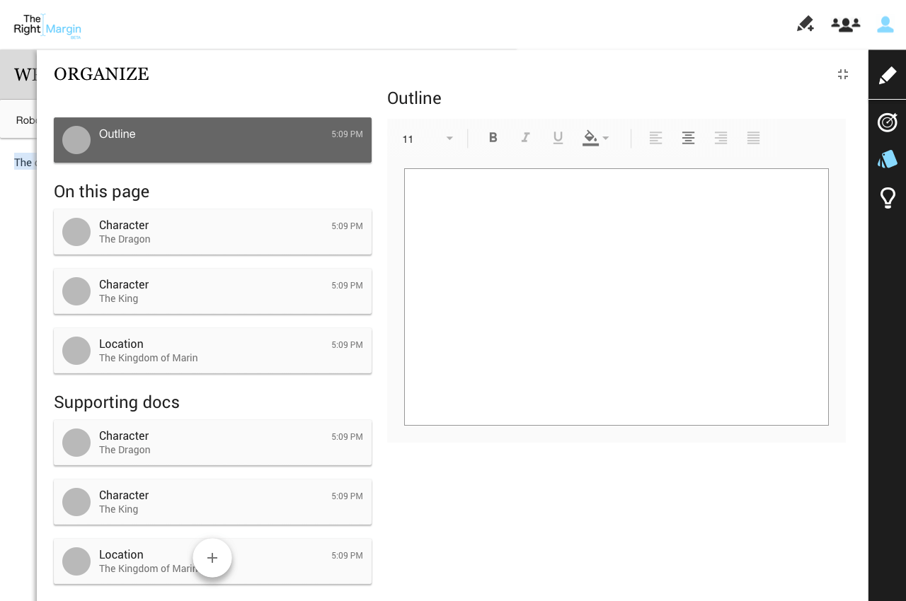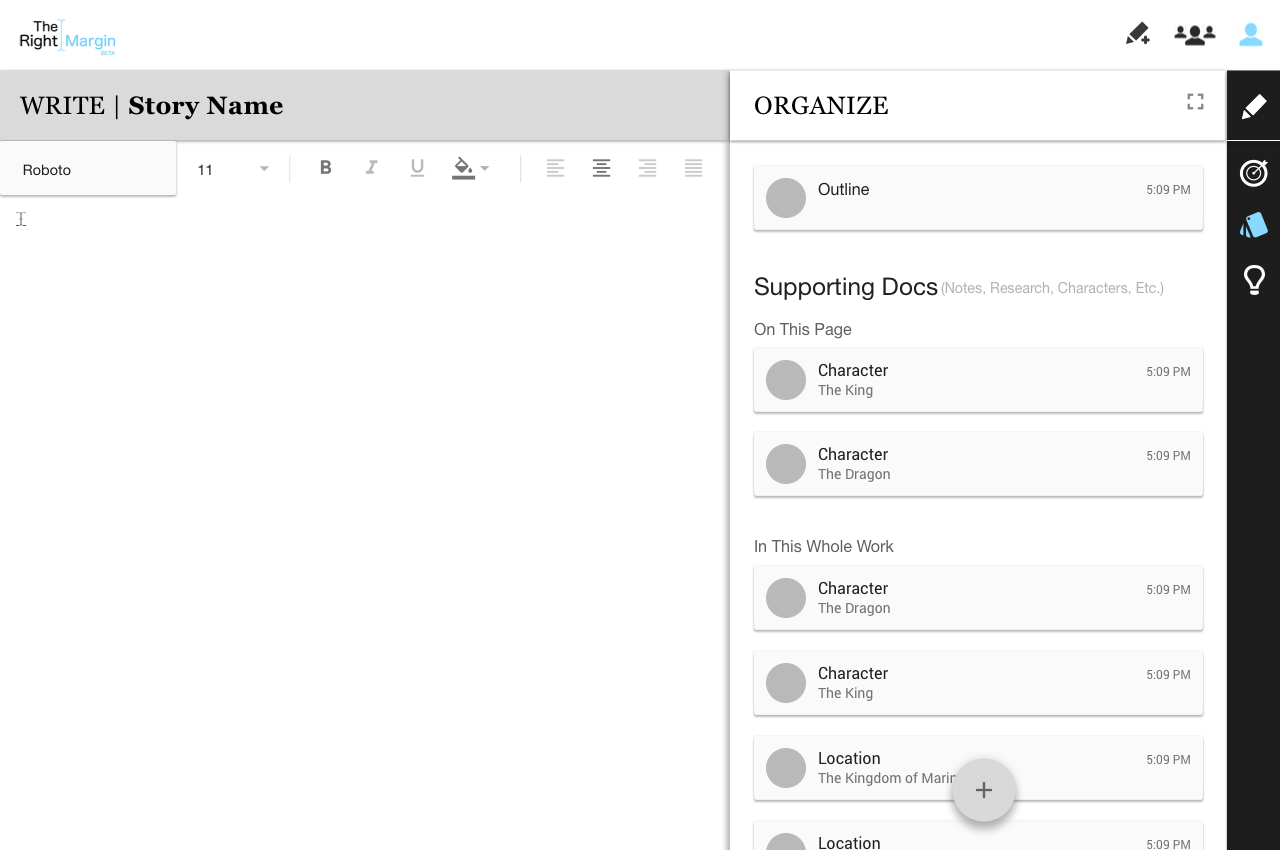 On the right margin of the screen, the writer is provided with functionality to help them with their goals, organizing their thoughts and obtaining inspiration.