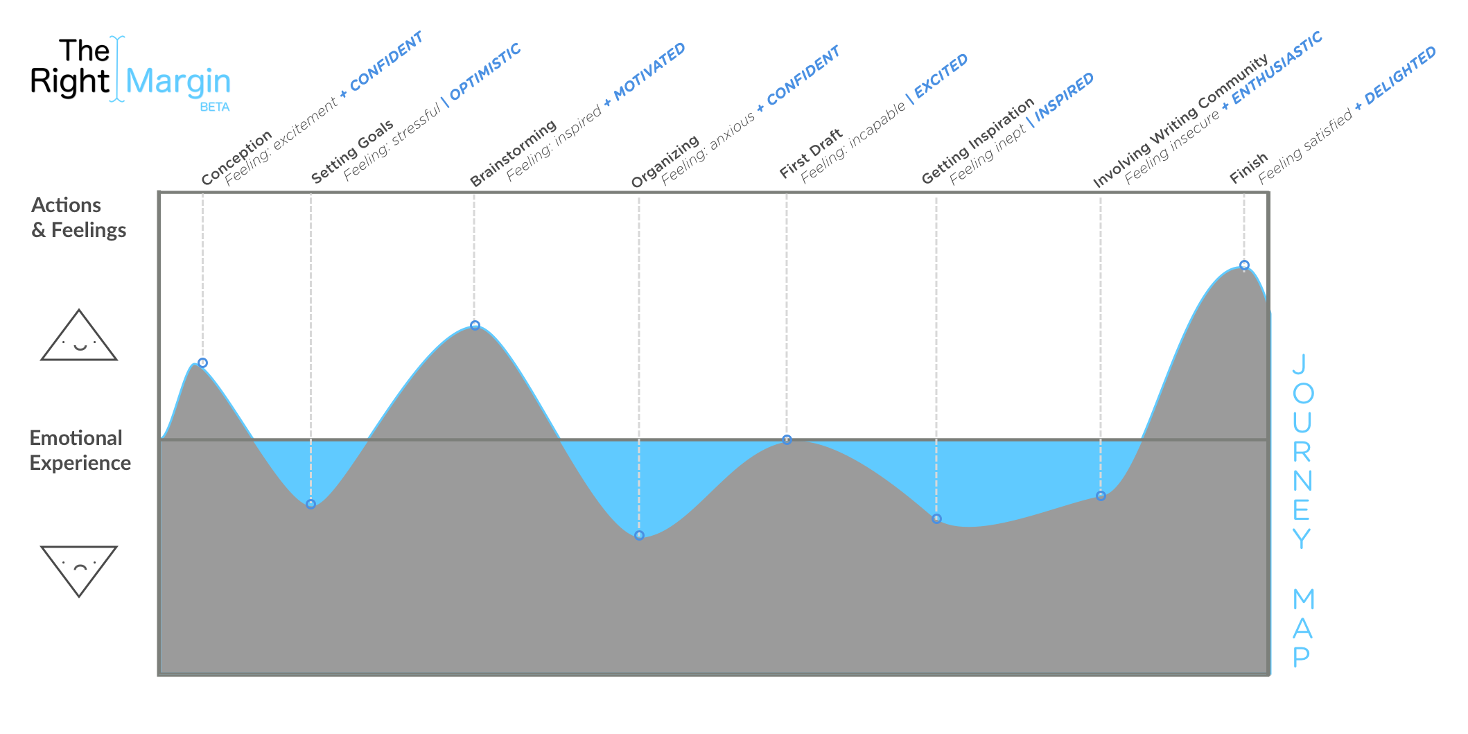We used Jeremy's emotional experience throughout his writing journey to identify key areas of opportunity for The Right Margin. Aligning this process with the client's business goals, we identified 3 primary areas of opportunity and 1 secondary area of opportunity: