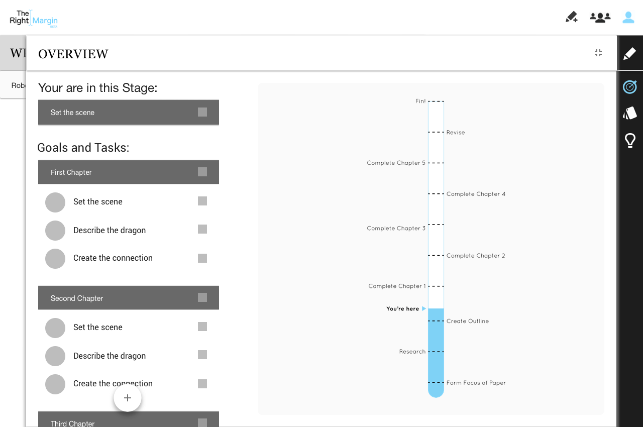 Our solution was to help our clients gain insights into their target audience while helping them work on a product redesign. We identified key areas of opportunity based on in-depth research of potential users. We also provided the team with wireframes that were scalable in design, allowing The Right Margin to focus on building out great features for any particular area of opportunity but also add features to support the entire writing journey as the product expands.