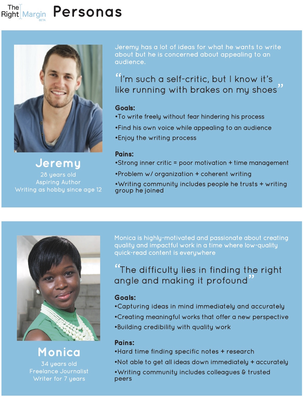 We then developed two district personas to help guide our designs: Jeremy the Aspiring Author and Monica the Freelance Journalist, both with distinct goals and pains.