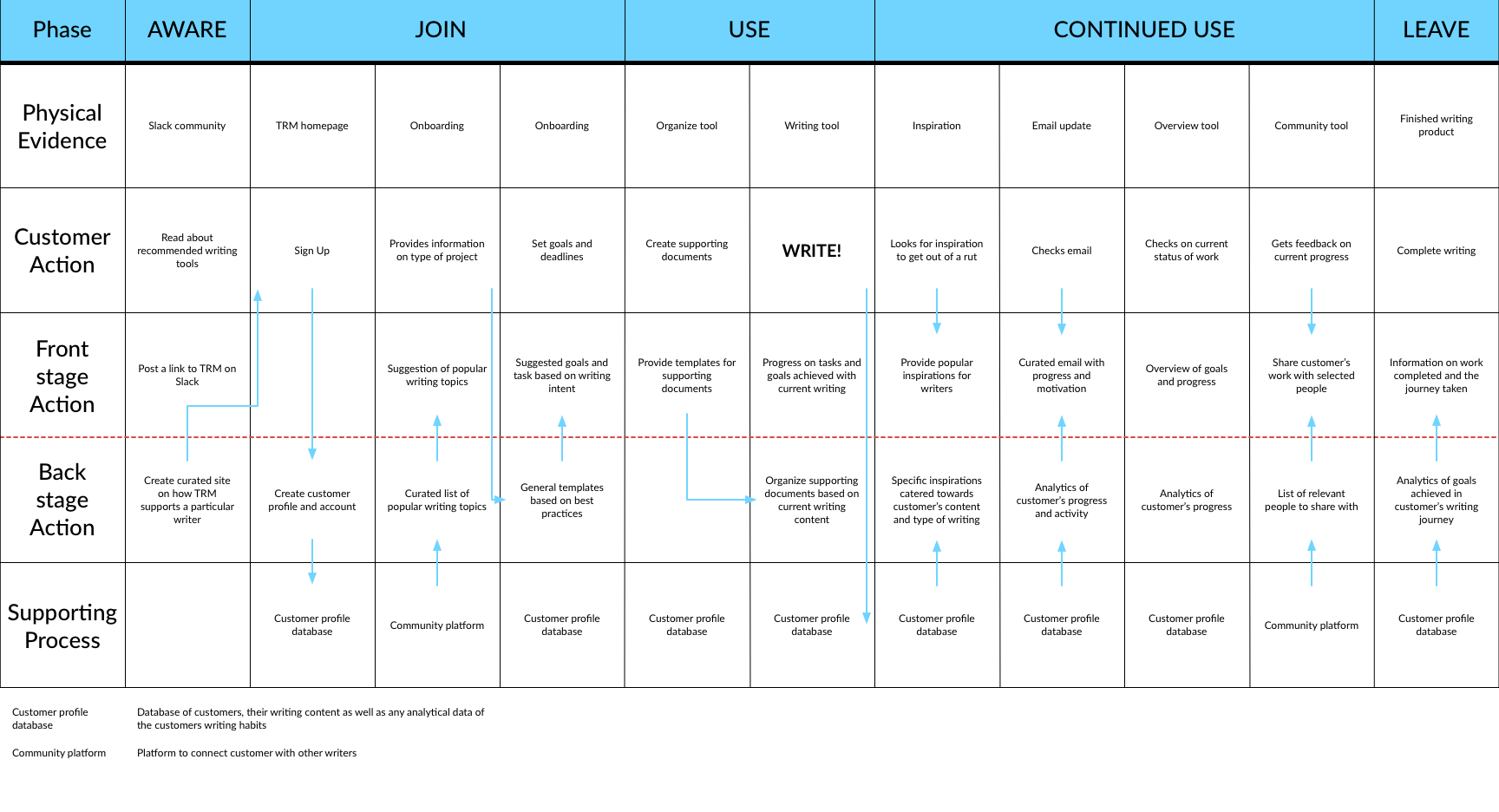 We provided the team at The Right Margin with tools to understand the bigger picture when designing for writers. Using a Service Blueprint as shown below, we show the journey of a potential new user to The Right Margin, from their experience discovering the product to the end when they complete their writing.